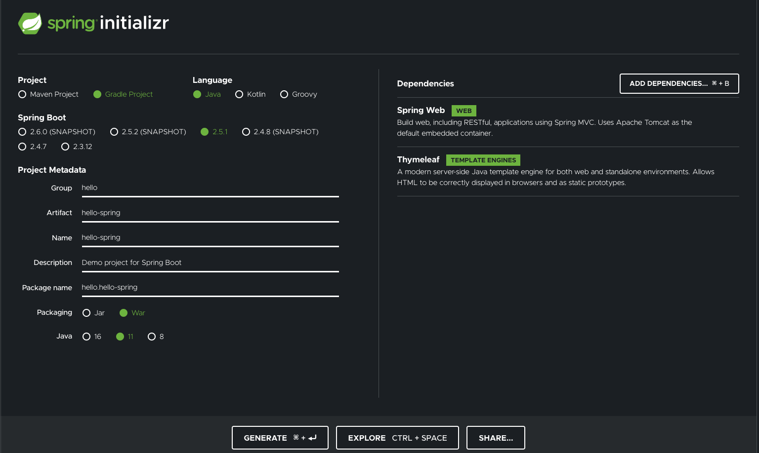 Spring Boot Download Page : start.spring.io 1. 기본 설정 1. Maven Project , Gradle Project : 라이브러리 및 버전 관리 툴 2. Spring Boot Version: SNAPSHOT(개발 중인 버전) 3. Group : 보통 기업 도메인 명을 적는다. 4. Artifact : 빌드되어 나오는 결과물(프로젝트 명) 5. Dependencies : 필요한 라이브러리를 끌어오는 역할 (중요)